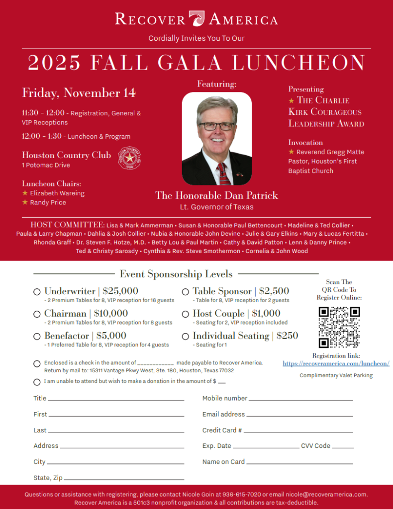 Recover America Fall Gala Luncheon+ Add to Google Calendar+ iCal / Outlook export DateNov 14 2025 Time 11:15 am More InfoRegister Here LocationHouston Country Club1 Potomac, Houston TX 77057Organizer Recover America Email info@recoveramerica.com Register HereShare this event